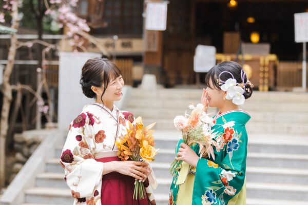 - 着物:華やか、袴:落ち着いた色